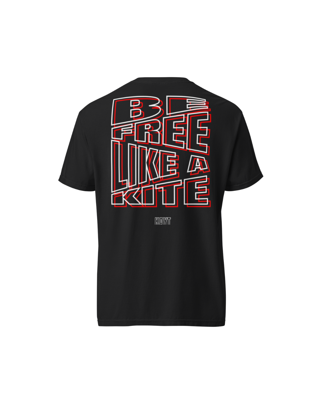 - Diseño minimalista en la parte frontal con un pequeño icono de una cometa, mientras que la parte trasera destaca con un mensaje audaz y dinámico: "Be Free Like a Kite", resaltado con un efecto 3D en rojo y blanco.